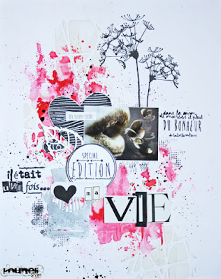 Une page réalisée avec la dernière collection de papier de Manuela que j'adore, le dies "timbre" de chez la Scraposphère et toujours les pates 3D de chez Aladine avec ce pochoir Spray & Scrap que j'utilise constamment